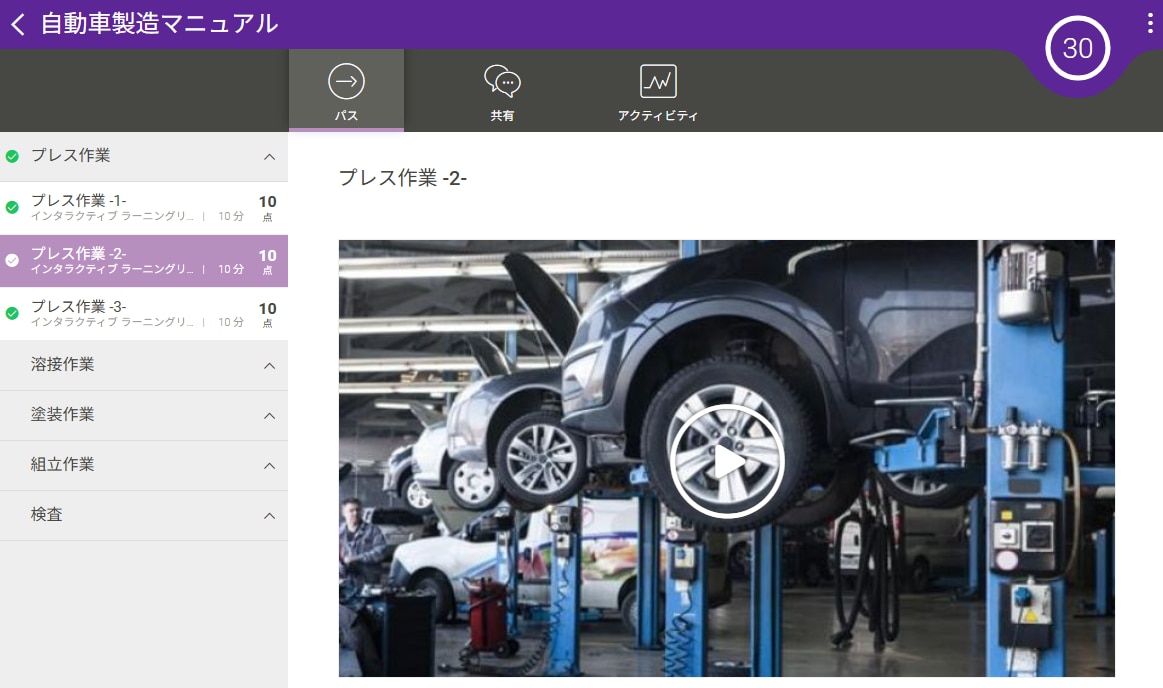 上図の1枚目はコース一覧の画面、2枚目は「自動車製造マニュアル」をテーマとしたコースの画面となります。上図のように、必要な知識や業務マニュアルなどを載せておくことで、社員自ら必要なときにアクセスする習慣が身に付きます。