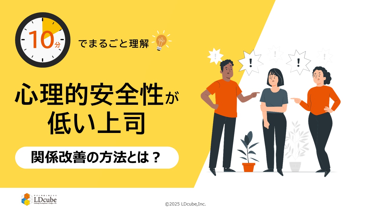 研修のスタイルにとらわれない企業向け人材育成サービスを提供する株式会社LDcube(本社:東京都千代田区、代表取締役社長:新井澄人、以下「当社」)は、「10分でまるごと理解!心理的安全性が低い上司 関係改善の方法とは?」を無料公開しましたので、お知らせします。