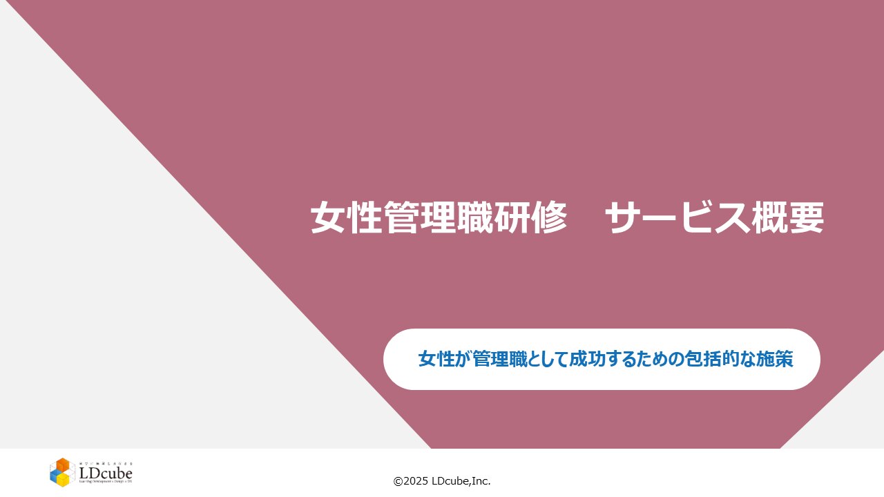 研修のスタイルにとらわれない企業向け人材育成サービスを提供する株式会社LDcube(本社:東京都千代田区、代表取締役社長:新井澄人、以下「当社」)は、「女性管理職研修サービス資料」を無料公開しましたので、お知らせします。