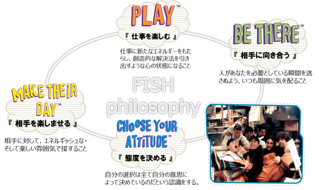 FISH!プログラムは、「仕事を楽しむ」「相手を楽しませる」「相手に向き合う」「態度を決める」