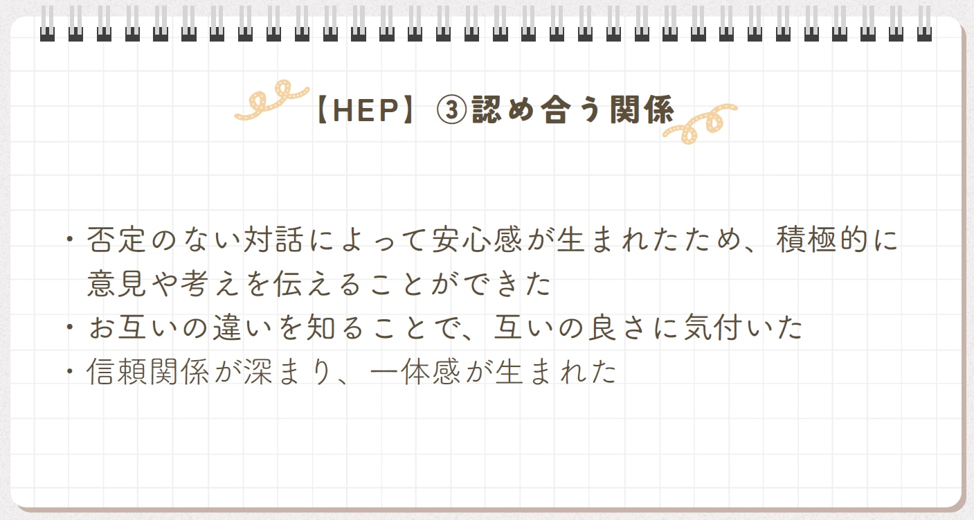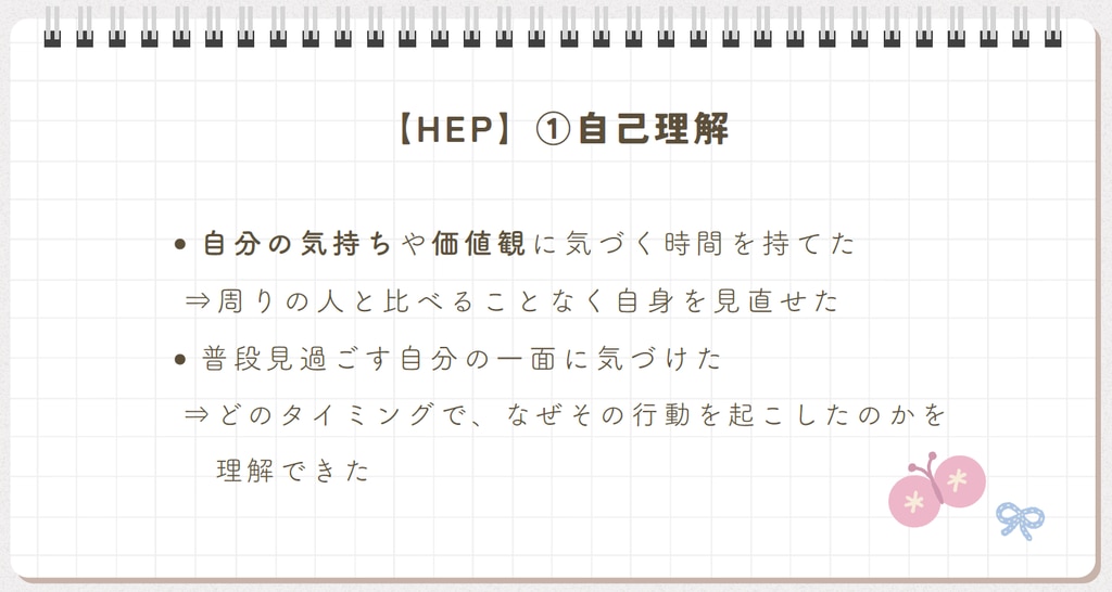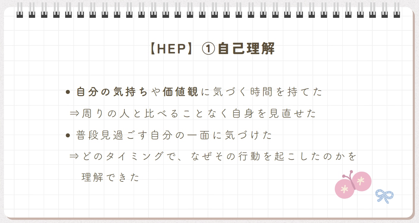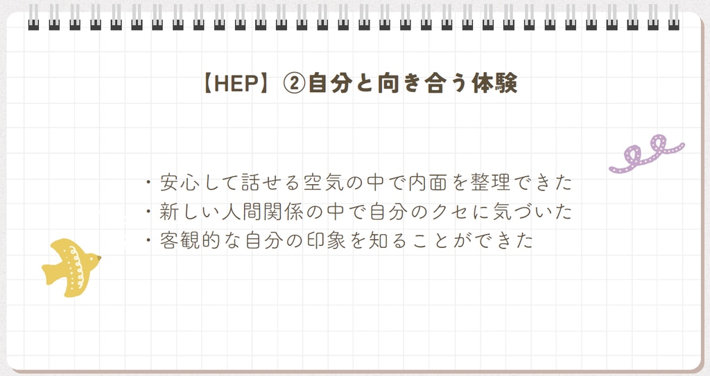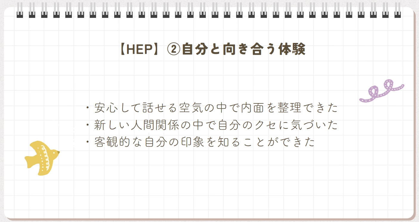 HEPを通して、自分の感情に気づき、防衛や自分の状態を理解する習慣が身につきました。その結果、これまで他人と比較して落ち込んでいましたが、今後は自分を受け入れ、SNSに振り回されず自分に合った使い方ができるようになりました。