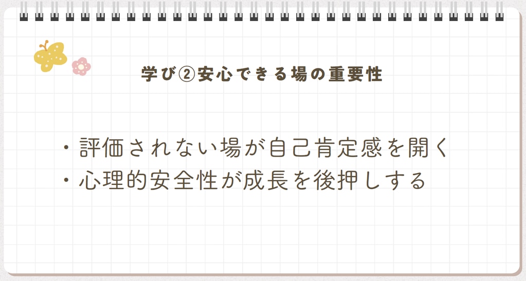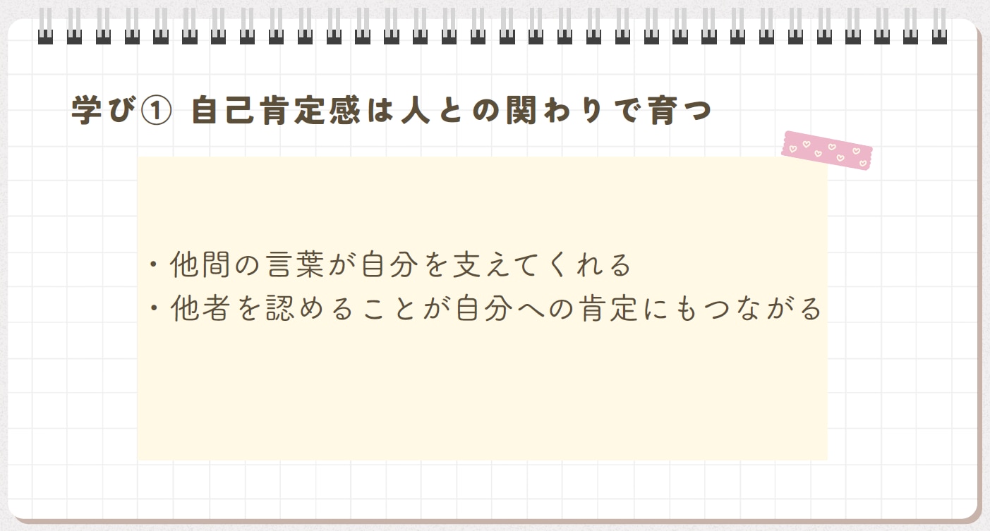 自己肯定感を高めることは相手を大切にすることにもつながり、自分を受け入れることがより良い人間関係や安心感のあるコミュニケーションにつながるのだと感じました。