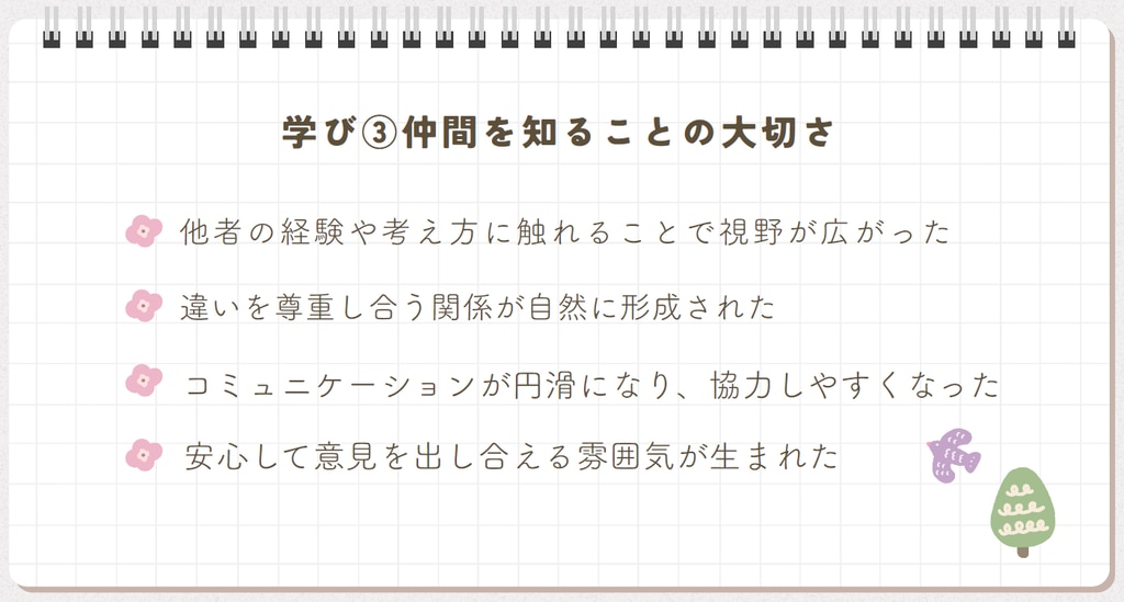 自己肯定感を理論的に学び、「防衛」という無意識の反応が、かえって自分を苦しめていることに気づきました。謙遜のつもりで自分を下げていた言動が、防衛だったと理解できたことは大きな発見でした。感情を言語化するジャーナリングや、感謝を伝え合う活動を通して、自分と向き合う大切さを改めて実感しました。