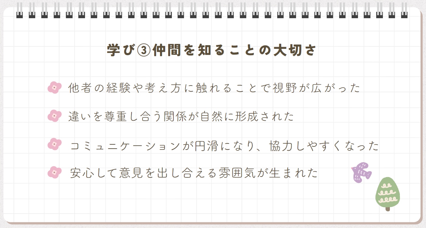 自己肯定感が低い状態は誰にでも起こり得ることで、必要以上に恥ずかしがるものではないと学べたことが印象的でした。人生を振り返るワークやゴミ拾いの実験を通して、自分の態度や表情が周囲に与える影響を体感しました。グループ活動を重ねる中で、自分の考えを少しずつ伝えられるようになり、人と関わりながら学ぶ楽しさを実感しました。