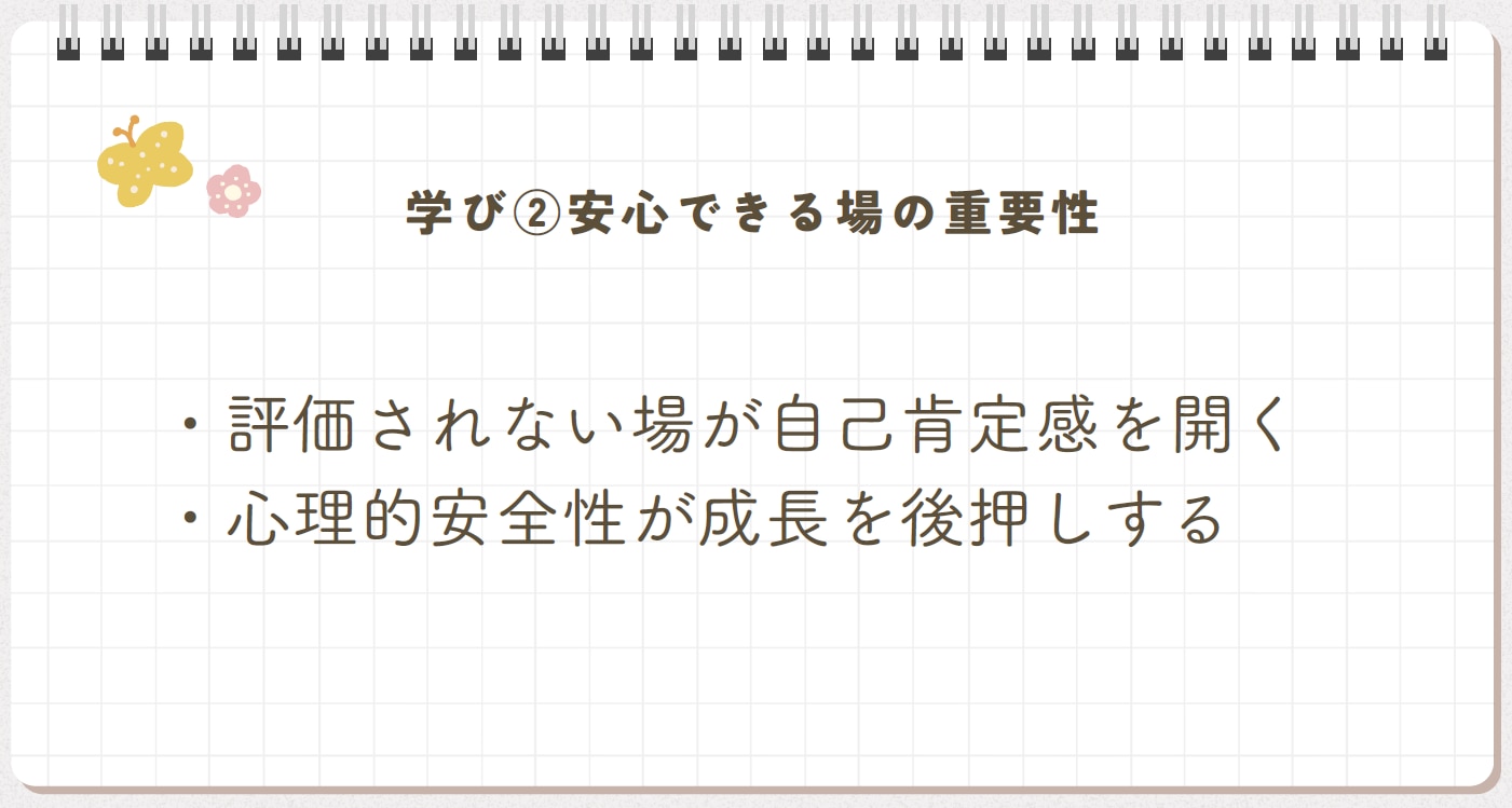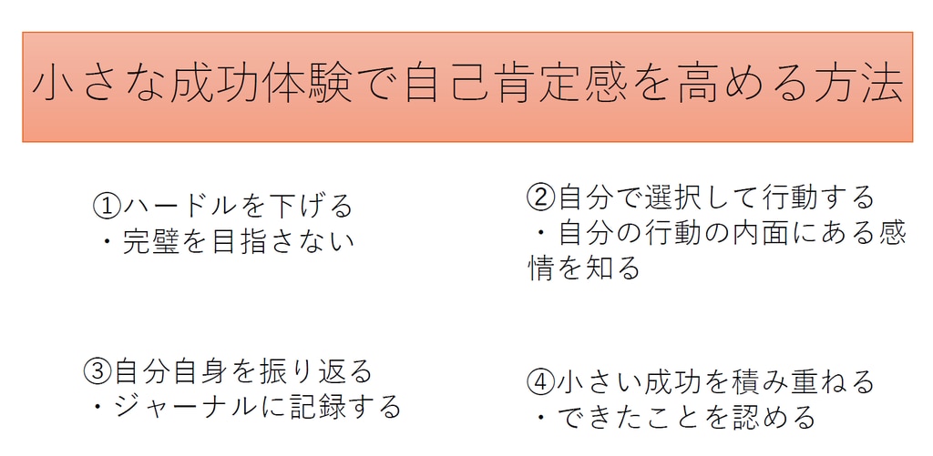 自己肯定感は大きな成功で高くなるわけではなく、小さな「できた」の積み重ねだということを学びました。