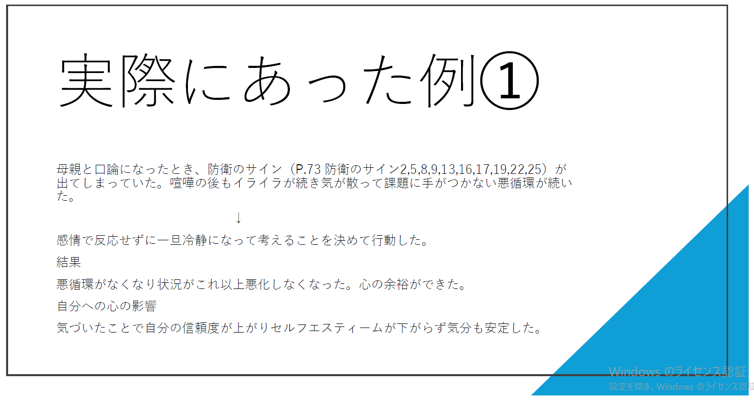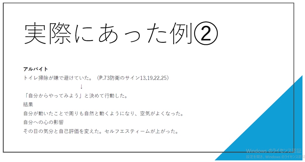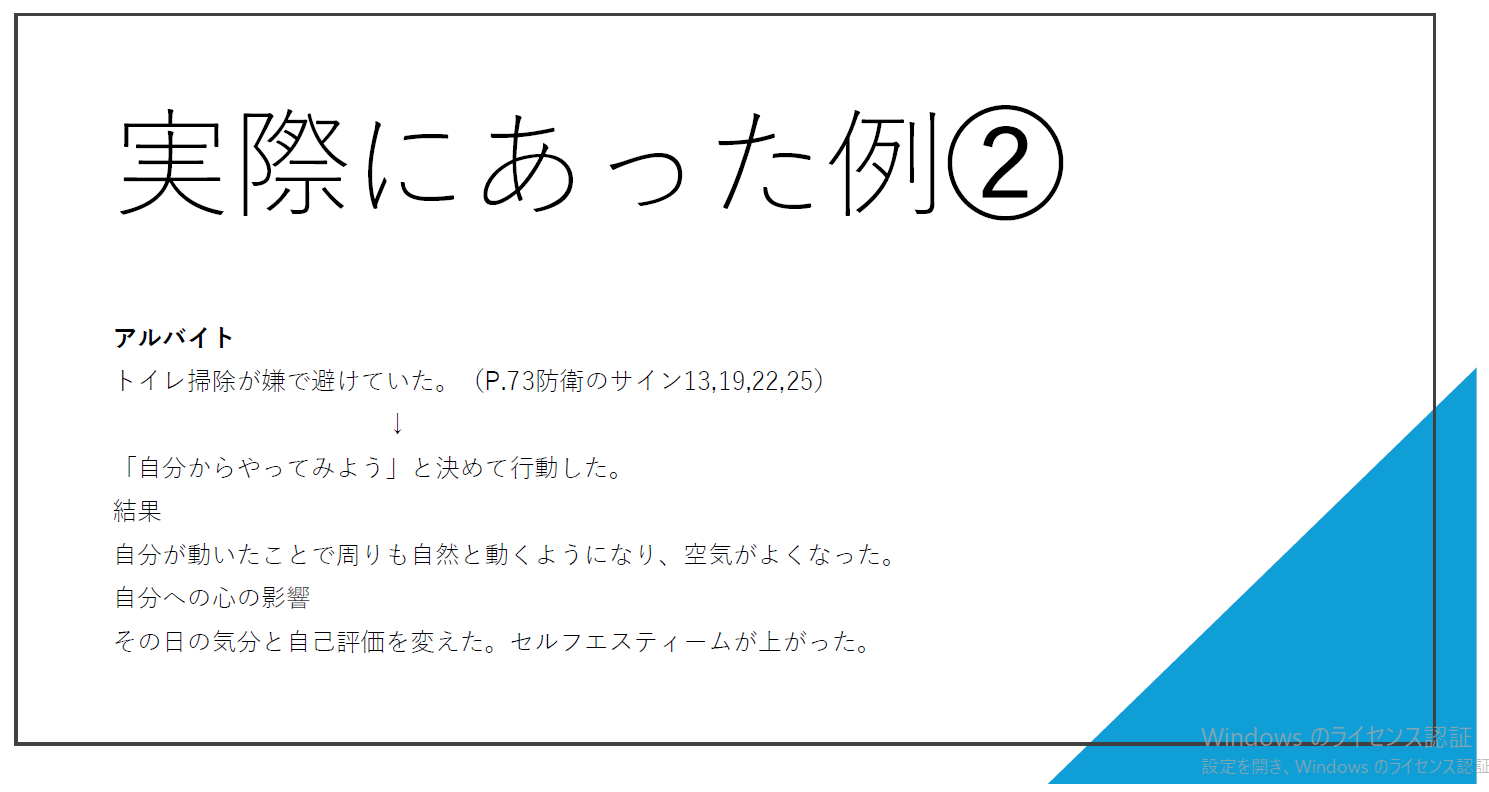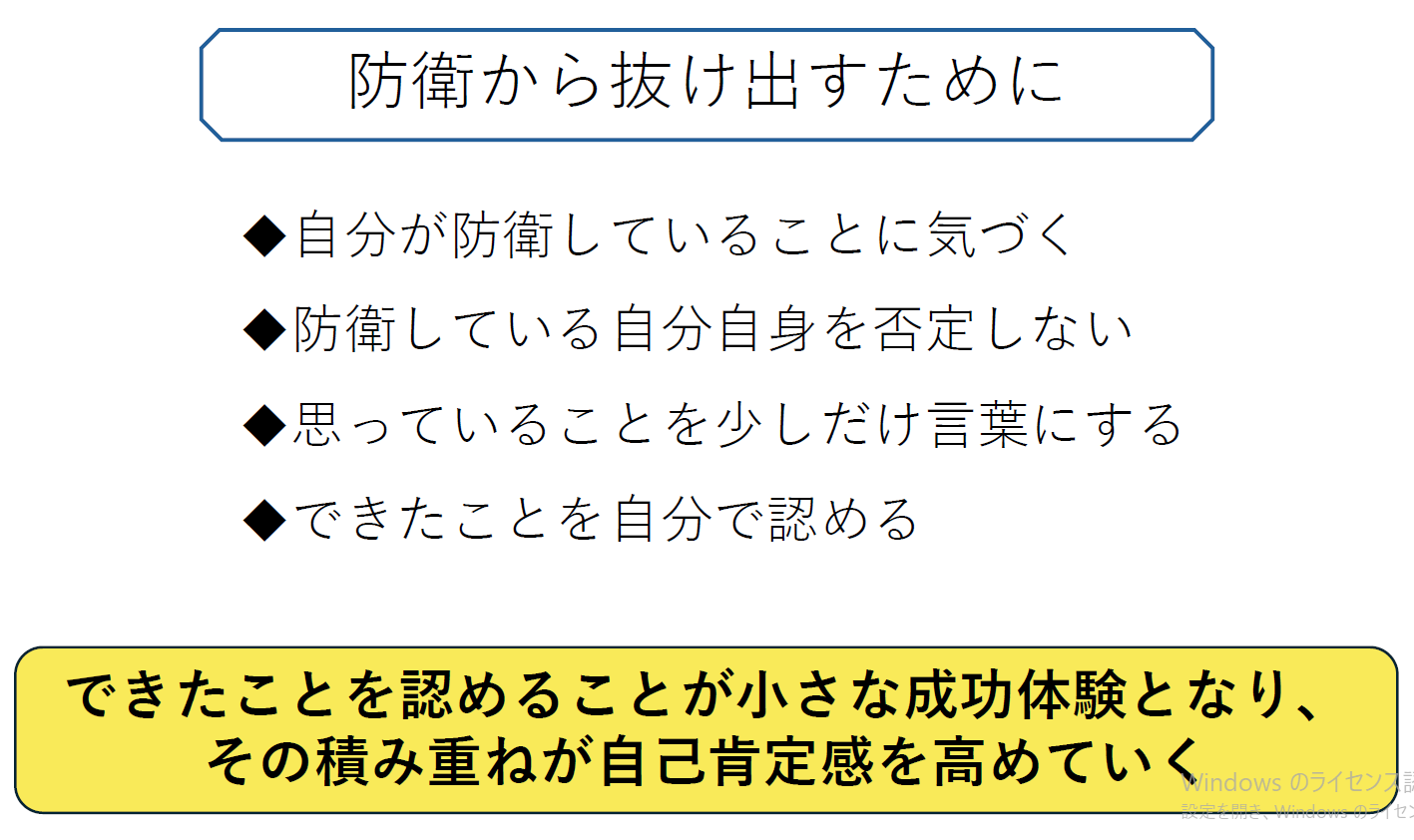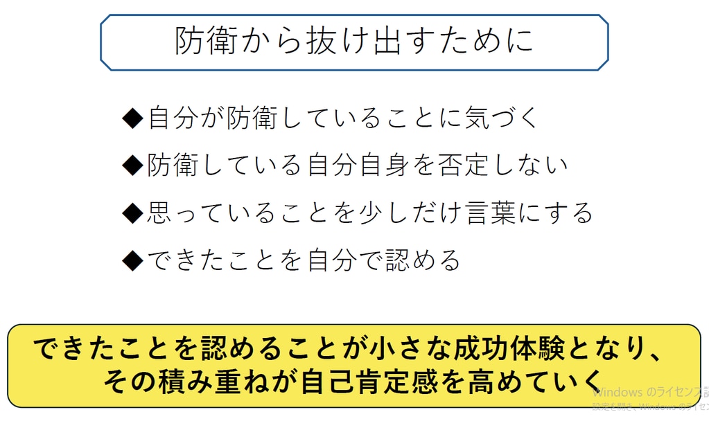 防衛から抜け出し、小さな成功体験を積み重ねることで、自己肯定感が高まっていくことを体験的に学びました。