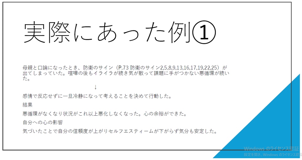 具体的には、”防衛”に気付くことでセルフエスティームが本当に上がるのかを検証したり、小さな成功体験がセルフエスティームに与える効果を整理したり、セルフエスティーム学習を通じた自己内省で得られたことをまとめたりするなどしました。