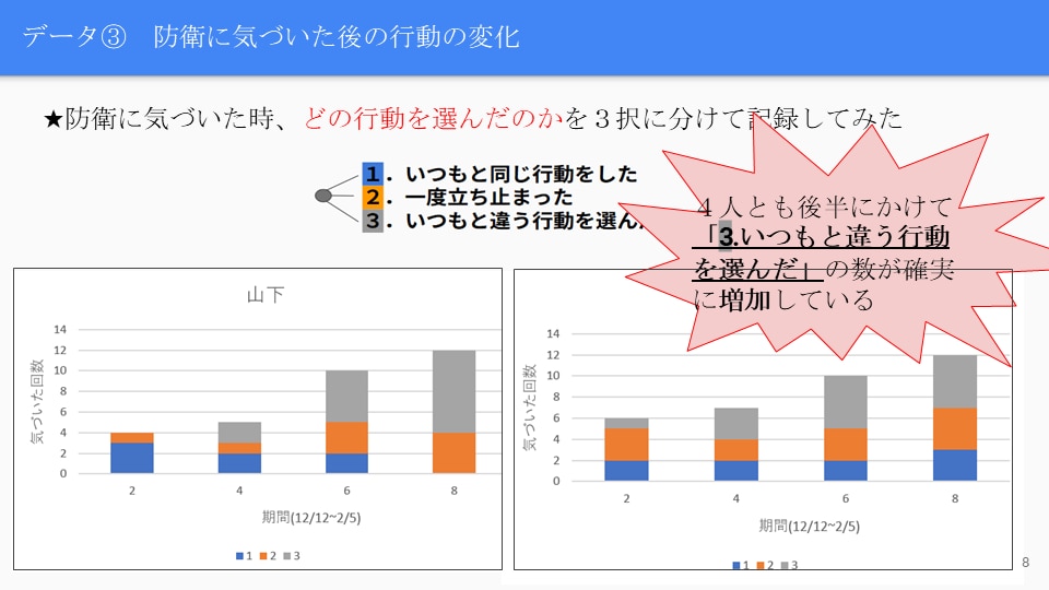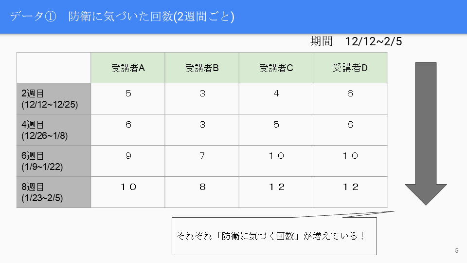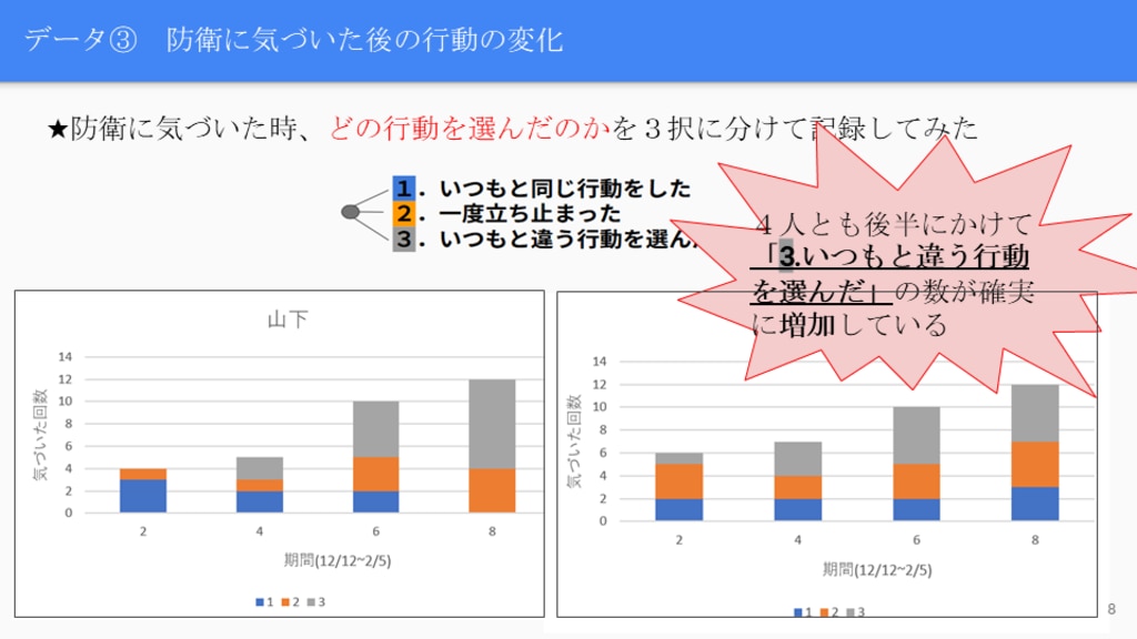 ⇒「防衛への気づき」「行動の変化」「感情の変化」が同じ方向に推移していることがわかった。