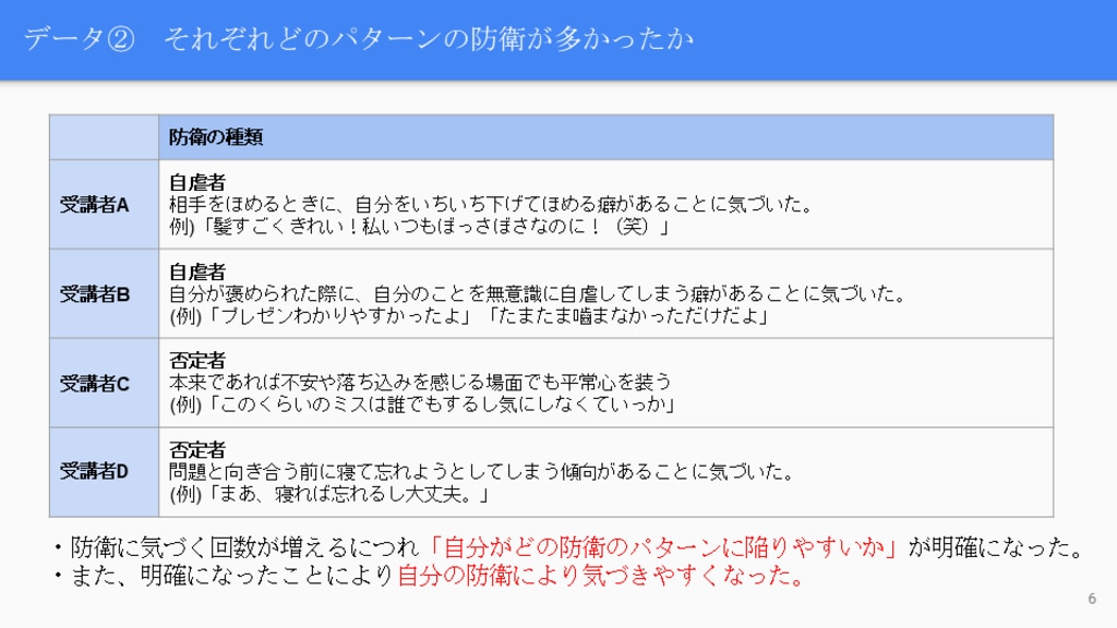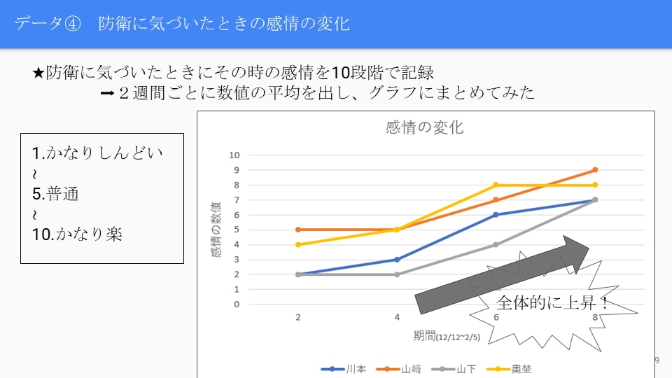 セルフ・エスティームが上がったと断定することは難しいが、防衛に気づくことは自己肯定感にポジティブな影響を与えたということが検証できました。