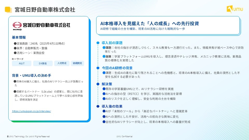 「しかし、リスクを正しく理解し、ルールを守って賢く使えば、これほど強力なビジネスサポートはありません。今回、使い慣れたUMUの提供会社から学ぶことで、社員はスムーズに新しい知識を吸収し、AIへの不安を払拭して、今後の導入への大きな可能性を感じることができました」。